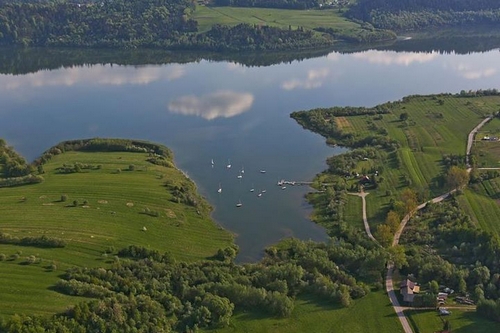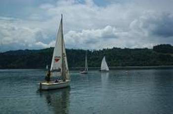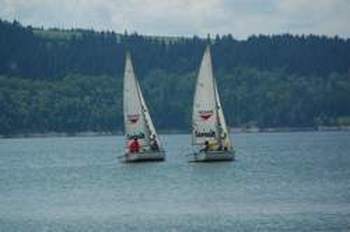 Po południu czekała nas jeszcze jedna niespodzianka - przepiękne słońce oraz wiaterek /3 - 4 bft/ umożliwił krajobrazowy mini rejsik w kierunku zapory - 3 jednostki kl. Puck /Banan, Biały i Lubań/ oraz Delfinek wraz z załogami podziwiali piękny krajobraz jeziora pomiędzy dwoma zamkami /Czorsztyn Niedzica/.